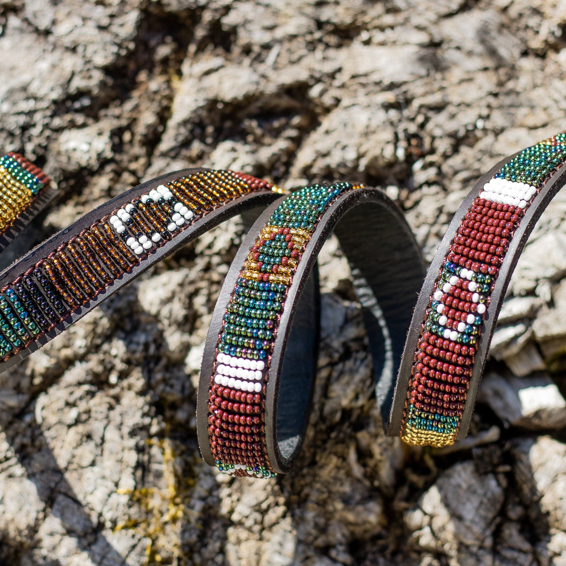 Laisse pour chien en cuir marron avec perles et boucle en laiton. Les laisses sont joliment perlées à la main avec de la perle de rocaille.