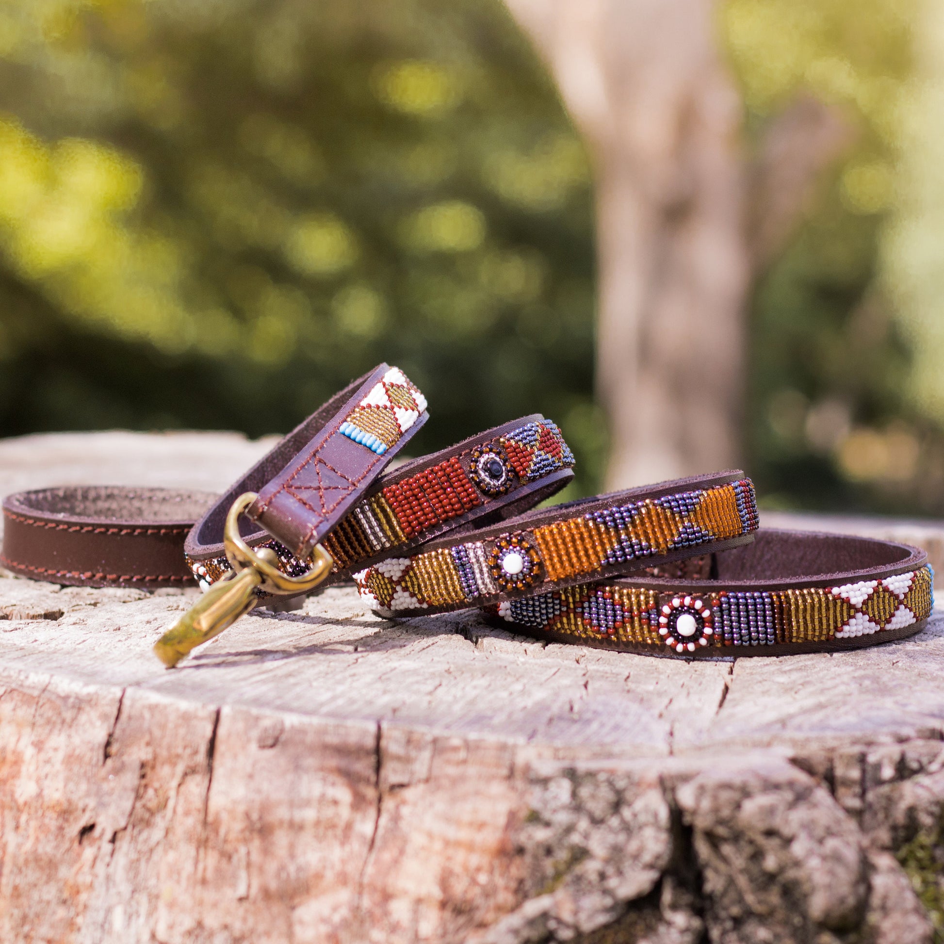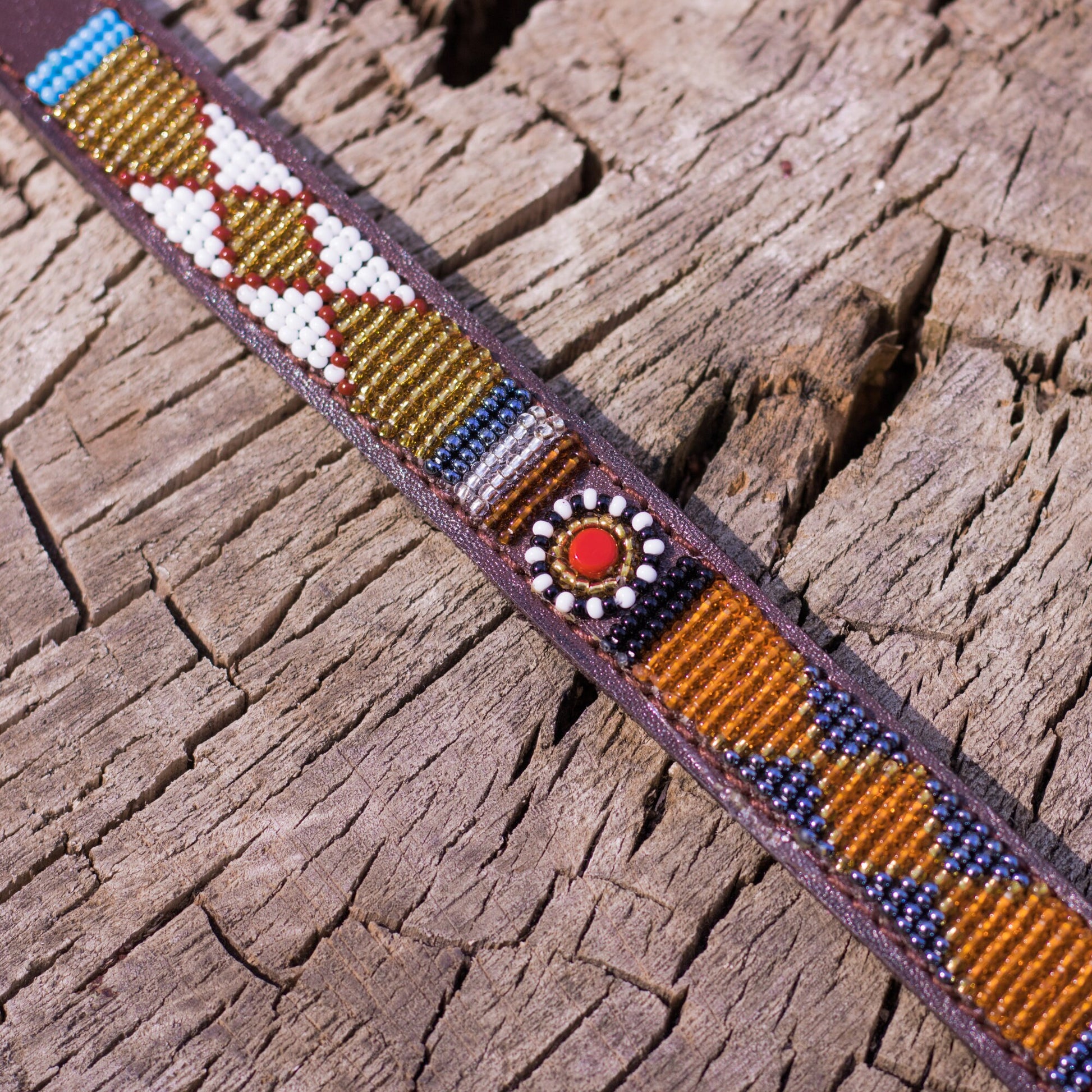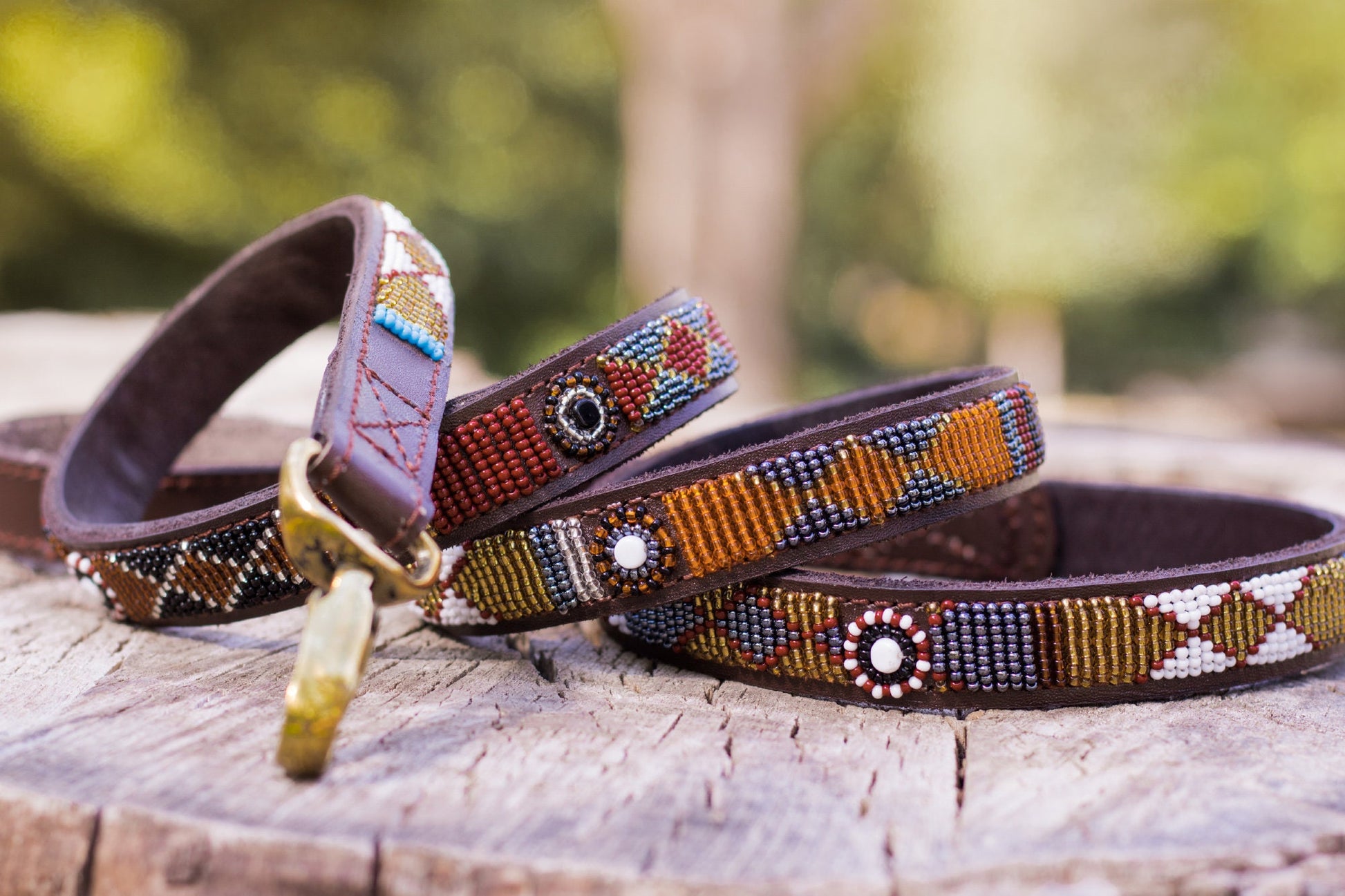 Laisse pour chien en cuir marron avec perles et boucle en laiton. Les laisses sont joliment perlées à la main avec de la perle de rocaille.