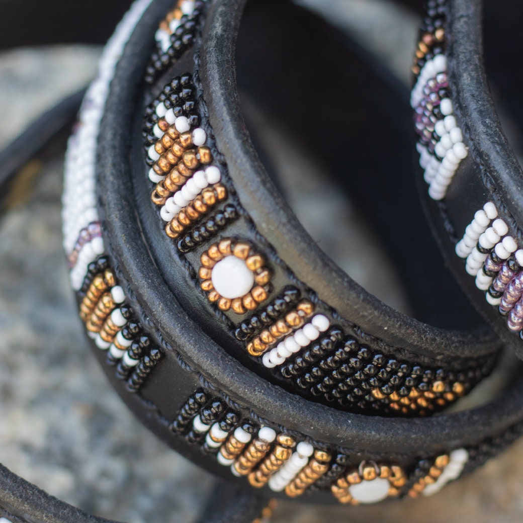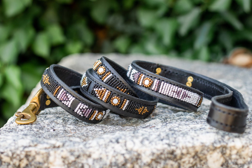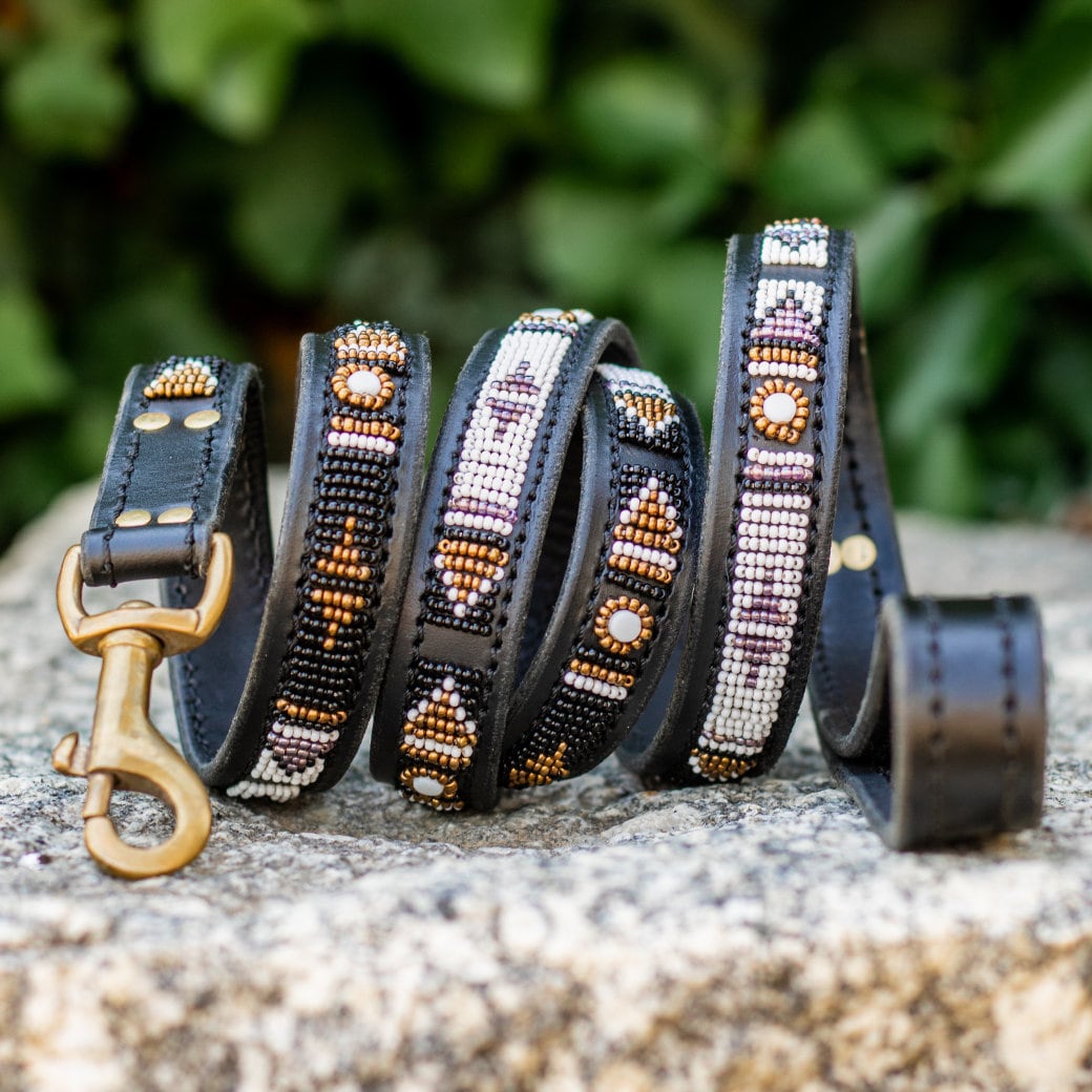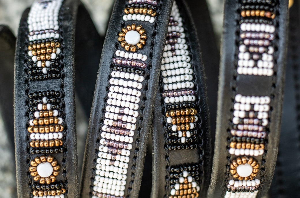 Laisse pour chien en cuir noir avec perles et boucle en laiton. Les laisses sont joliment perlées à la main avec de la perle de rocaille.